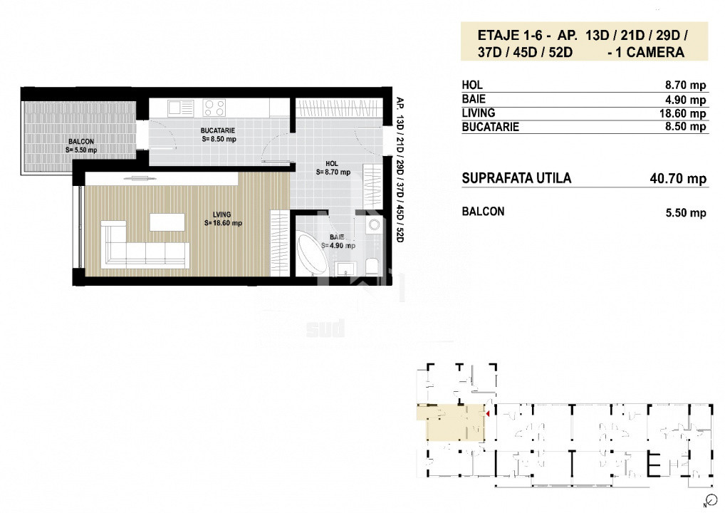 Garsoniera are o compartimentare moderna: hol generos cu spatiu pentru depozitare, bucatarie inchisa cu acces catre balcon, o camera generoasa si luminoasa.