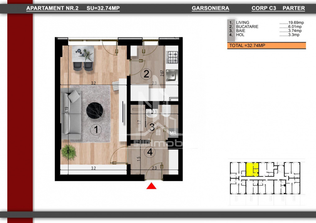 Dispune de o compartimentare moderna cu hol la intrare cu spatiu pentru depozitare, Bucatarie inchisa si de finisaje premium.