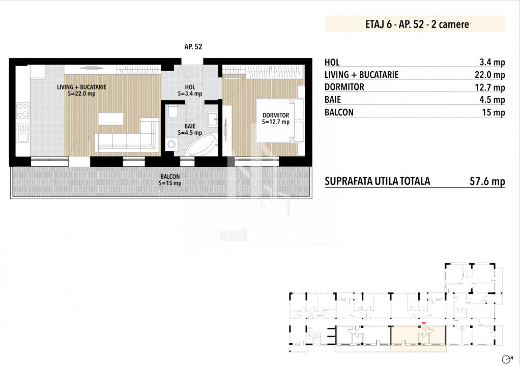 Agentia SUDIMOB va propune spre achizitie un apartament de 2 camere open space, geam la baie si terasa de 15 mp intr-un ansamblu rezidential cu 2 lifturi situat pa Dealul Cucului in sector 4.