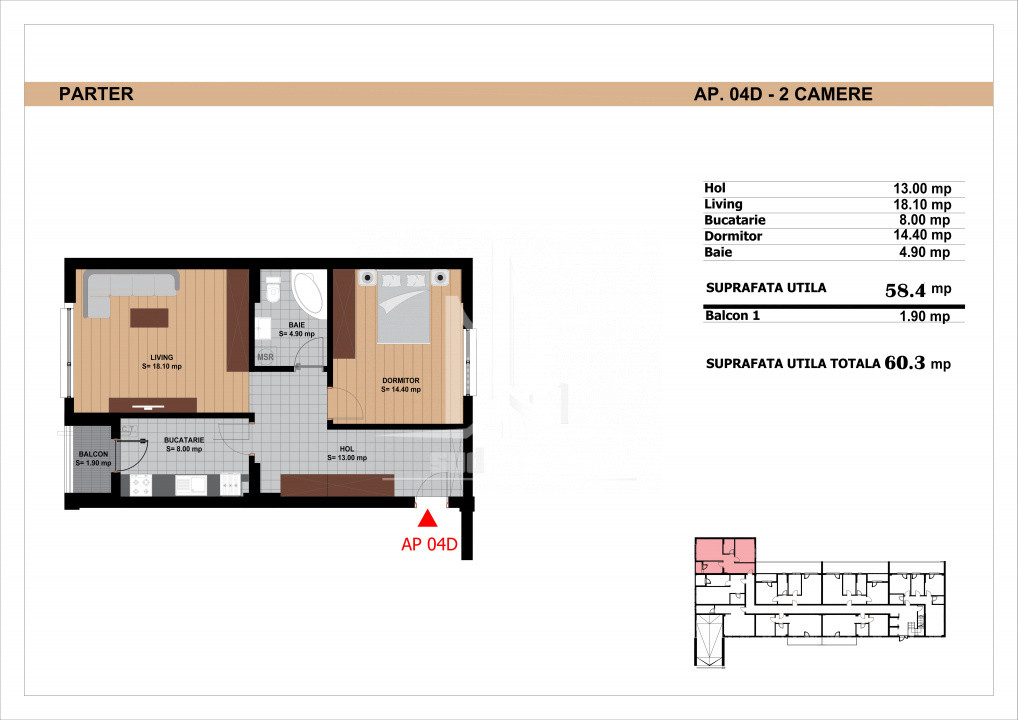 Locuinta are o compartimentare moderna cu doua camere spatioase si luminoase, bucatarie inchisa, un hol generos cu spatiu pentru dressing de 13mp, baia este echipata cu obiecte sanitare moderne, balconul este inchis cu tamplarie PVC.