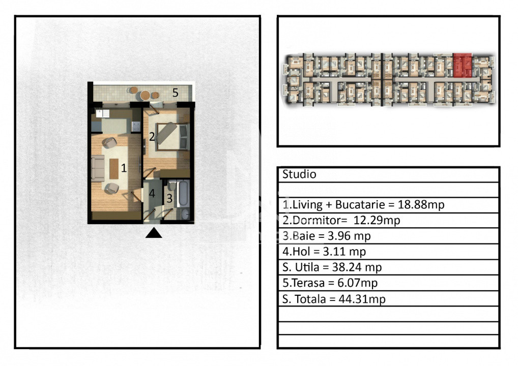 Apartamentul dispune de o compartimentare moderna cu hol la intrare, baia este dotata cu cada, dormitor luminos, bucataria open space se integreaza perfect in zona de living. Cu o mica investitie bucataria de poate prelungi pe jumatate din suprafata balconului de 6mp.