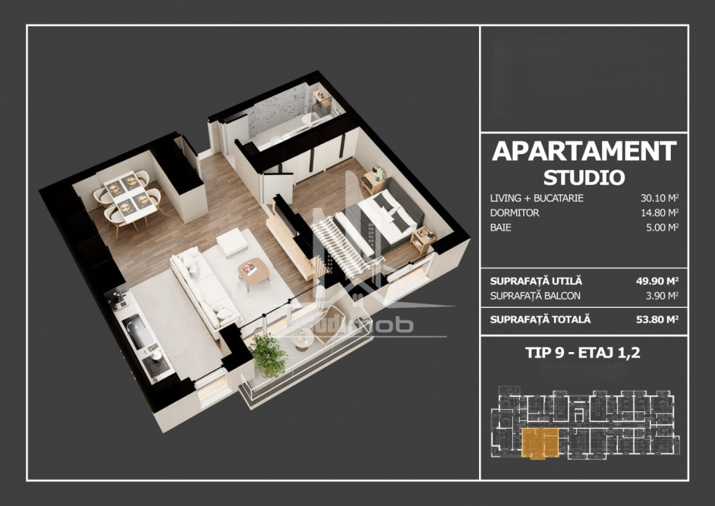 Va propun spre vanzare un apartament cu doua camere tip studio intr-un bloc tip boutique cu 3 etaje care va fi finalizat cel tarziu in luna august.