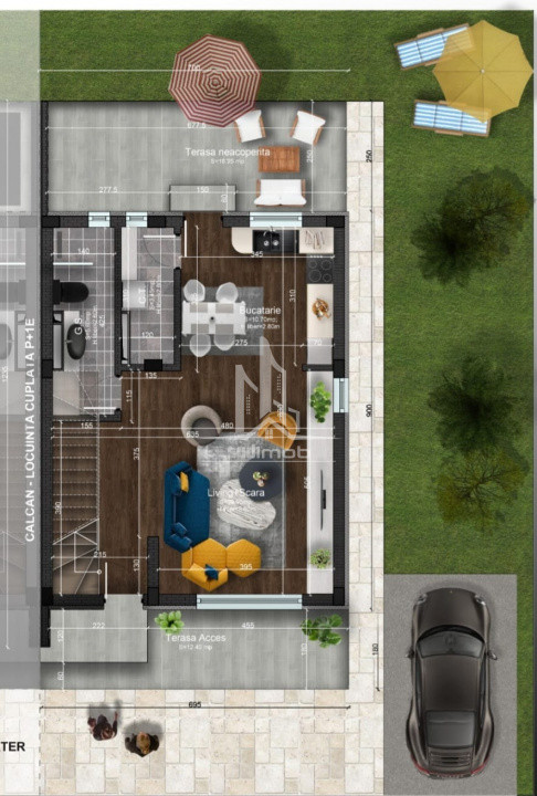 Pe parter avem living cu bucatarie open space, baie cu cabina de dus si geam si acces catre curte. Curte libera 200 mp ce se va preda amenajata cu gazon.
