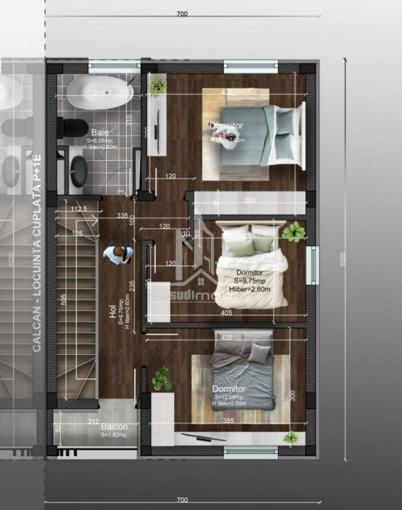 La etajul 1 avem 3 dormitoare, baie mare cu geam si un balcon. Deasupra etajului 1 avem un pod ca si spatiu de depozitare cu acces pe scara tip chepeng.